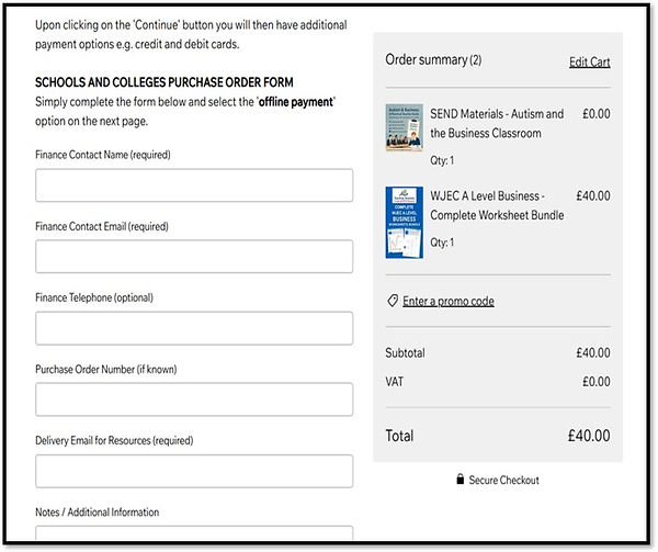 Q. How can schools and colleges place purchase orders with Teaching Business?